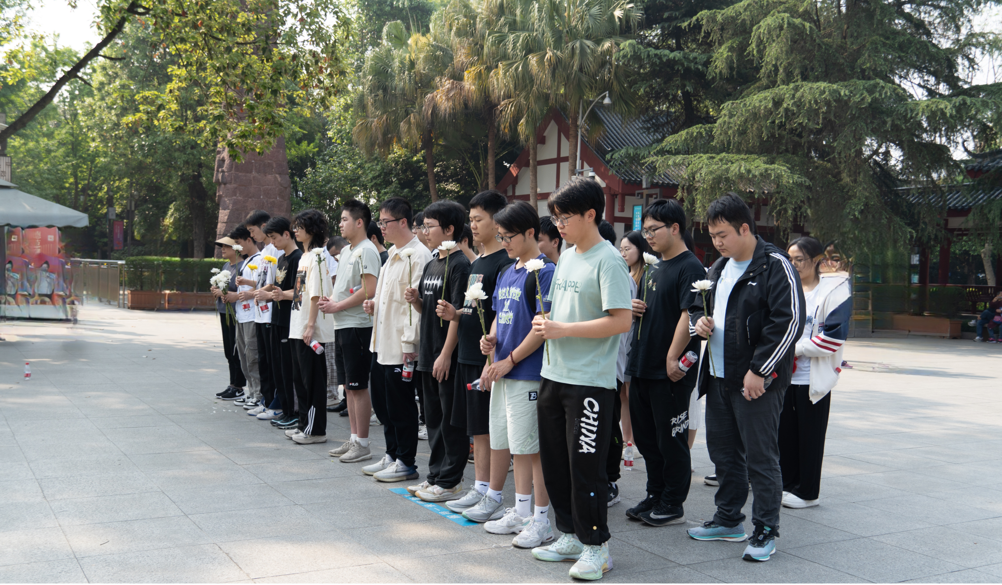 上午9点30分,纪念活动正式开始,全体学生怀着崇敬的心情,手捧鲜花,有序排列,向十二桥烈士们鞠躬致意,敬献手中鲜花,表达对革命先烈们的崇高敬意和深切怀念。