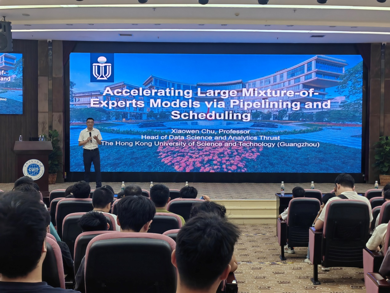 9月20日下午,应伟德国际1946邀请,香港科技大学(广州)数据科学与分析学域主任褚晓文教授在国际会议厅作题为《Accelerating Large Mixture-of-Experts Models via Pipelining and Scheduling》的学术报告。本次报告由学校副校长、伟德国际1946院长吴锡教授主持,伟德国际1946部分教师、全体研究生及22级本科生参加了现场报告和学术交流。
