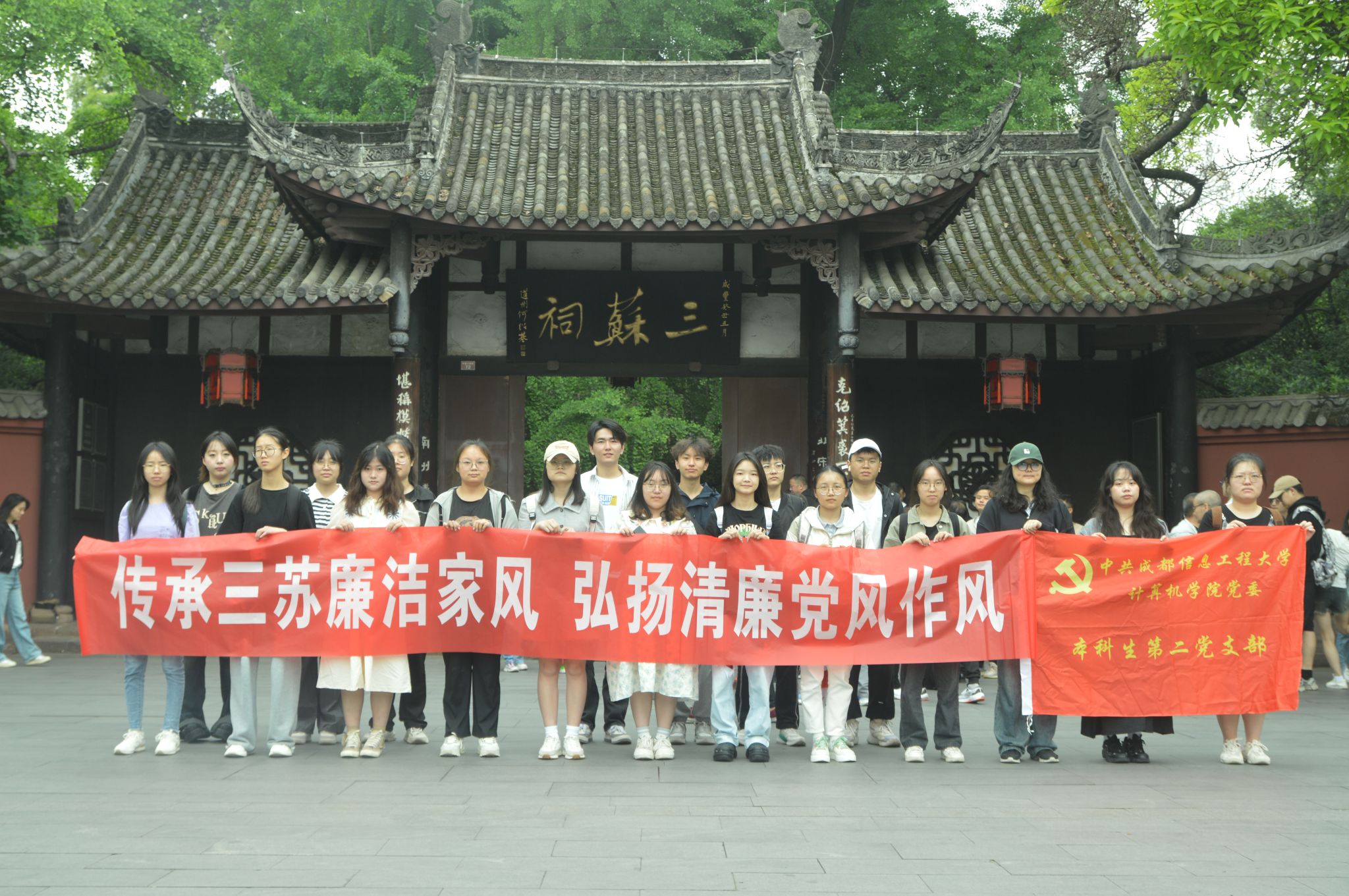 学生党员在三苏祠接受文化熏陶,听三苏故事、品三苏家风、学三苏为人做官之道。活动现场充满了活力和热情,同学们的积极参与和热切关注,为活动增添了无限生机和活力。他们不仅仅是参与者,更是家风教育和党风建设的坚定支持者、践行者和传播者。此次实践教育活动将引导广大党员学生认真学习《中国共产党纪律处分条例》,真正做到清白做人、勤俭持家、干净做事、廉洁从政,管好自己和家人,涵养新时代共产党人的良好家风,弘扬清廉党风作风,共同建设一个廉洁、公正、有序的社会。