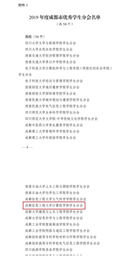 近日,成都市学生联合会下发《关于表扬2019年度成都市优秀学生会 (研究生会)、优秀学生分会(研究生分会)、 优秀学生会(研究生会)工作人员的通报》,经组织申报、学校初评公示、市级评审,我院荣获2019年度成都市优秀学生分会称号。